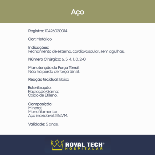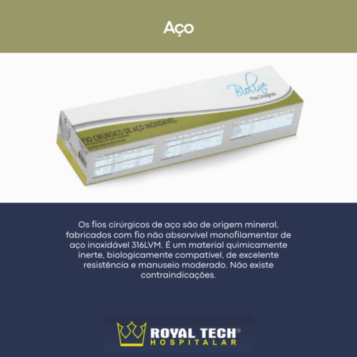 É um fio de sutura não absorvível fabricado em de aço inoxidável tipo 316. Esta liga de aço contém: Ferro, Cromo, Níquel, Molibdênio, Carvão, Manganês e outros elementos que garantem uma liga de uso cirúrgico. Este monofilamento se caracteriza por sua fácil manipulação e uma dureza entre 80.000 e 90.000 lbs por polegada quadrada.