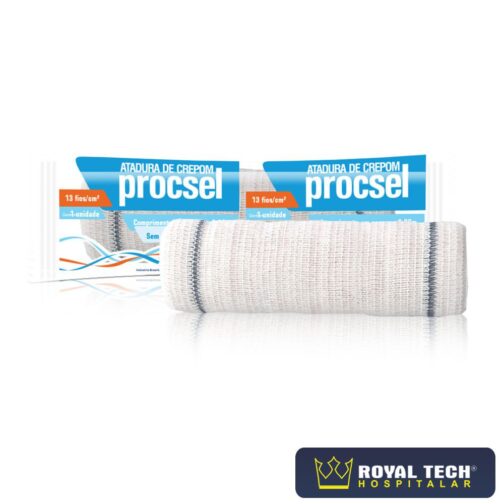 As ataduras de crepom PROCSEL são flexíveis e confortáveis, mantendo ótima relação entre compressão e elasticidade resultando em melhor mobilidade e conforto durante o uso. São confeccionadas com tecido misto, sendo 90% algodão, 9% poliéster e 1% elastano, possuem densidade de 13 fios/cm2 e medem 1,80m de comprimento em repouso.