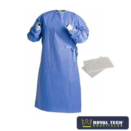 Soldado por ultrassom em áreas de junção de não tecido, garantindo proteção contra agentes contaminantes. Possui manga longa, punho de malha. Acompanhado de toalha absorvente de não tecido spunlace (40cm x 50cm)