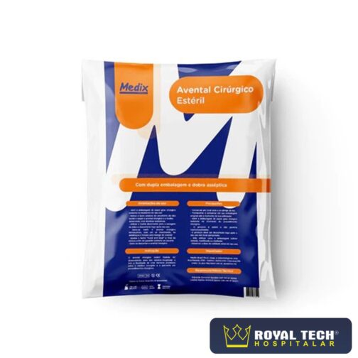 Avental Cirúrgico Estéril Descartável Manga Longa. Com dupla embalagem, possui TAG de transferência asséptica para
