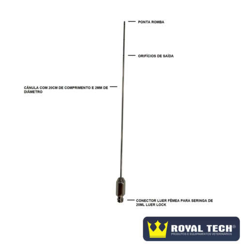 A Cânula de Klein para uso veterinário da Royal Tech Import é confeccionada com aço inoxidável de alta qualidade para proporcionar um procedimento cirúrgico com maior precisão. Possui o comprimento de 20cm, circunferência de 2mm (3 French), ponta romba, orifícios laterais para saída da solução e uma conexão luer para uso de seringa de 20ml luer lock. Instrumento ideal para utilização na técnica de anestesia infiltrativa por tumescência. Produto comercializado não estéril, necessitando ser esterilizado antes do uso. Após ser utilizado o produto deverá ser lavado e seco imediatamente.
