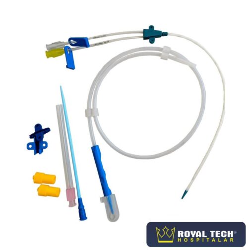 Cateter venoso central de duplo lúmen, de curta permanência, para até 30 dias de implantação, fabricado em poliuretano macio e biocompatível, radiopaco, graduado a cada centímetro, diâmetro externo com 3.5, 04, 4.5, 05, 5.5, 06, 6.5, 07 e 7.5 Fr. e comprimento com 05, 08, 13, 15, 20 e 30 cm, conectores luer lock e pinças em cada via do cateter. Vem acompanhado de 1 dilatador de veia, 1 guia metálico em aço inoxidável com núcleo em nitinol, 1 agulha introdutora e 1 aleta de sutura móvel com trava.