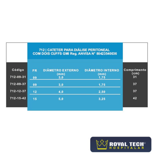 O Cateter para Diálise Peritoneal GMI é fabricado em silicone grau médico. Possui dois “cuff” de fibra de poliéster que servem para fixar o cateter. Possui uma linha radiopaca para facilitar a visualização radiográfica. Apresenta-se com diferentes calibres e comprimentos. Indicado para neonatologia, pediatria e em adultos. O produto se completa com uma extensão com conexão luer lock.