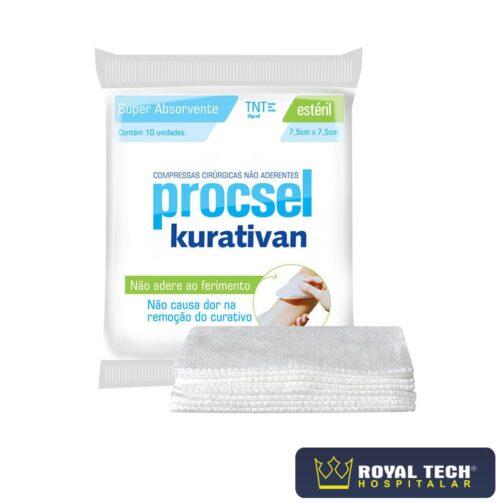 A Compressa Cirurgica Estéril Kurativan PROCSEL é elaborada com tecido-não-tecido TNT, 40g/m2, 70% viscose e 30% poliester.