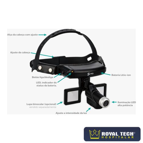 O equipamento é composto pela estrutura principal para suporte na cabeça, fonte de luz (LED) e bateria. Os componentes da estrutura principal são fabricados em plástico leve.