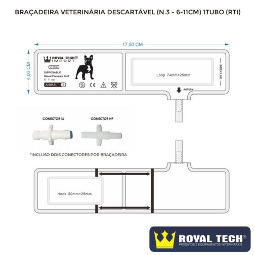A braçadeira veterinária descartável da Royal Tech Import é confeccionada com componentes de alta qualidade para proporcionar uma aferição da pressão arterial não invasiva fidedigna. Possui na sua constituição 2 conectores diferentes por braçadeira que possibilita o uso em diversos esfigmomanômetros ou monitores multiparamétricos do mercado. Produto isento de látex.