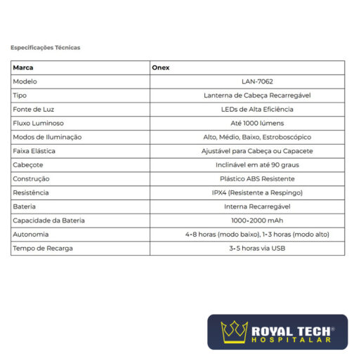 A Lanterna de Cabeça Recarregável Onex conta com iluminação potente de até 1000 lúmens com LEDs de alta eficiência. Possui modos ajustáveis e design leve e confortável para uso prolongado. Faixa elástica ajustável para cabeça ou capacete, cabeçote inclinável em até 90 graus, construção em plástico ABS resistente e certificação IPX4 contra respingos.